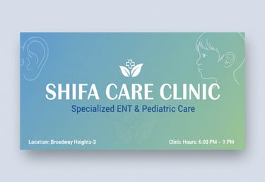At Shifa Care Clinic, we are dedicated to providing expert and compassionate healthcare, specializing in both comprehensive Child Care and advanced Ear, Nose, and Throat (ENT) services. Our experienced Doctors are committed to nurturing the health and well-being of your little ones, offering everything from routine check-ups and immunizations to managing common childhood illnesses. For adults and children alike, our state-of-the-art ENT department addresses a wide range of conditions affecting hearing, breathing, and vocal health, ensuring you receive the highest quality of specialized care under one trusted roof. We pride ourselves on creating a welcoming and supportive environment where every patient, from newborns to adults, receives personalized attention designed to promote lasting health.